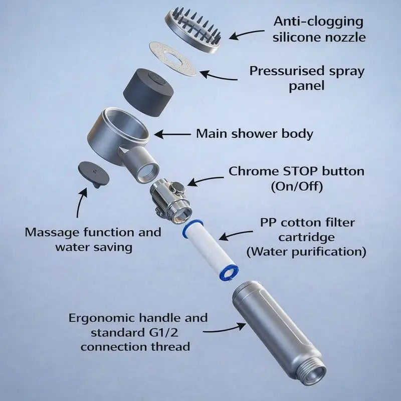 Zeyra AquaPure™ filters impurities directly at the source, while enhancing water pressure and control. Instead of masking damage, it removes the cause — turning your daily shower into a refined care ritual.